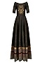 Featuring a black off shoulder brocade anarkali gown with gold print all over highlighted with zardozi and beads embroidery on the front yoke. It is paired with gold pants in raw silk with bird print all over.