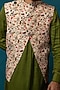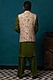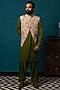 Featuring a beige koti jacket in silk and twill base with print. It is paired with an olive green pathani kurta and pants. Perfect for a wedding or reception ceremonies.