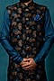 Featuring a black nehru jacket in silk base. It is paired with a blue kurta and churidar pants. Perfect attire for a wedding or engagement ceremony.