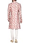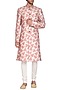 Featuring a blush pink sherwani jacket in silk base with mandarin collar and bhagalpuri print. It is paired with white matching churidaar pants.