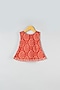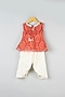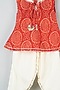 Featuring a red short kurta for girls in cotton base with tassels, magzi lace work, and bandhej print . It is paired with a contrasting off-white dhoti. Style it with cute hair accessories and sandals for festive occasions.