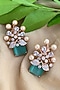 Featuring a pair of rose gold finish stud earrings studded with emerald and pearls, set in brass.