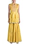 Featuring a mustard yellow peplum kurta in chanderi silk base with mirror embroidery. It is paired with matching sharara pants.