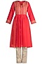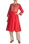 Featuring a red gathered kurta in chanderi silk base with aari work embroidery. It is paired with matching leheriya pants.