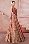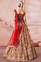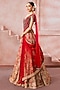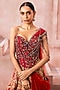 Featuring a cherry red lehenga in raw silk and tulle base with zardosi, sequins and resham embroidery. It is paired with a corset-style blouse having mirror embroidery and a sheer dupatta. Style this lehenga set with kundan polki jewellery and kolhapuri block heels. Complete the look with soft glam makeup and a sleek hairdo for your wedding or engagement ceremony.