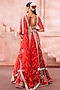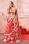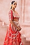 Featuring a deep red lehenga in raw silk and tulle base with pearl, stone, sequins and kundan embroidery. It is paired with an embroidered blouse and a sheer sequins dupatta. Style this lehenga set with kundan polki jewellery and kolhapuri block heels. Complete the look with soft glam makeup and a sleek hairdo for your wedding or engagement ceremony.