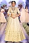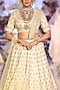 Featuring an ecru beige lehenga in raw silk and tulle base with cutdana, zari and pearl embroidery. It is paired with a mirror embellished blouse and a dupatta. These opulent bridal lehengas with intricate embroidery and rich detailing are perfect for wedding ceremonies, styled with green polki jewellery for an unforgettable bridal statement.