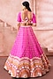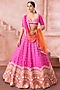 Featuring a hot pink lehenga in raw silk base with resham, zari and mirror embroidery. It is paired with an embroidered blouse and a tangerine tulle dupatta. Style this lehenga with timeless kundan-polki jewelry, comfortable block heels, and an embellished potli bag. Complete the look with soft glam makeup and a sleek hairdo for an elegant wedding or engagement ceremony.
