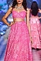 Featuring a hot pink lehenga in tulle base with motif, sequins floral embroidery. It is paired with an embroidered bustier and a dupatta. These opulent bridal lehengas with intricate embroidery and rich detailing are perfect for wedding ceremonies, styled with green polki jewellery for an unforgettable bridal statement.