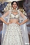 Featuring an ivory lehenga in silk and tulle base with stone, pearl and crystal embroidery. It is paired with an embroidered bustier and a dupatta. These opulent bridal lehengas with intricate embroidery and rich detailing are perfect for wedding ceremonies, styled with green polki jewellery for an unforgettable bridal statement.