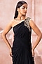 Featuring a jet black one-shoulder gown in satin base with crystal, stone and motif hand embroidery. Accentuate it with golden hoop earrings, metallic heels and a clutch for evening events, cocktail nights, red carpet or a sophisticated gathering.