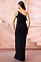 Featuring a midnight black one-shoulder gown in satin base with a sculpted front knot, cascading layered drape, zari, stone and motif hand embroidery. Accentuate it with golden hoop earrings, metallic heels and a clutch for evening events, cocktail nights, red carpet or a sophisticated gathering.