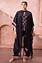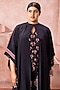 Featuring a midnight black cape in satin base with print. It is paired with pants and an inner. Accentuate it with gold jewellery, embellished heels and a clutch for a festive occasion or a pre-wedding ceremony.