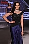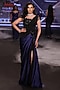 Featuring a midnight blue asymmetric gown in charmeuse satin base with a sculpted shoulder detail, cutdana and sequins embroidery. Styled with a dewy glow and sparkling jewels, this gown is made for unforgettable entrances at receptions and couture events.