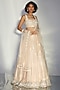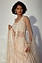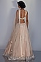 Featuring a novelle peach lehenga in tulle base with crystals, silver cutdana, stones, swarovski and pearl embellishments. It is paired with a matching blouse and a dupatta.