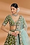 Featuring an olive green lehenga in silk base with gold zardosi embroidery. It is paired with a blouse having a V-neckline and embellishment, including a light blue tulle dupatta. Accentuate it with statement jewellery, a potli bag and embroidered block heels for a wedding, engagement, mehendi or sangeet ceremony.