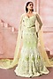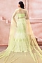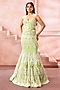 Featuring a pastel mint green mermaid skirt in tulle base with sequins, pearl and beads embroidery. It is paired with a structured corset and a drape. Accentuate it with zircon dangler earrings, a clutch and high heels for a reception, cocktail and engagement ceremony.