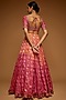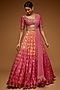Featuring a peach and pink lehenga in brocade base with woven banarasi detail. It is paired with a matching blouse having mirror and pearl, zardosi embroidery, tulle dupatta and a belt.