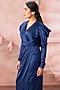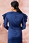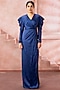 Featuring a royal blue structured draped gown in satin base with a V-neckline, accentuated shoulders and an exaggerated sleeves. Accentuate it with a diamond dangler earrings, metallic heels and clutch for evening events, cocktail nights, red carpet or a sophisticated gathering.