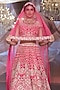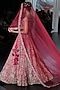 Featuring a ruby red lehenga in raw silk and tulle base with zardosi embroidery. It is paired with an embroidered blouse and a dupatta having sequins and beads work. These opulent bridal lehengas with intricate embroidery and rich detailing are perfect for wedding ceremonies, styled with green polki jewellery for an unforgettable bridal statement.
