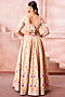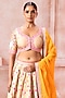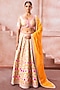 Featuring a soft beige lehenga in raw silk base with mirror, zari and floral motif embroidery. It is paired with a georgette embroidered blouse and a gold orange dupatta. Style this lehenga with timeless kundan-polki jewelry, comfortable block heels, and an embellished potli bag. Complete the look with soft glam makeup and a sleek hairdo for an elegant wedding or engagement ceremony.