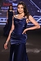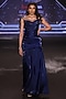 Featuring a teal blue draped gown in satin tissue organza base with a ruched bodice, shoulder drape and beads embroidery. Styled with a dewy glow and sparkling jewels, this gown is made for unforgettable entrances at receptions and couture events.