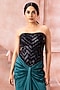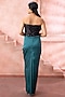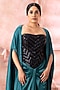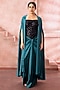Featuring a teal gown in satin base with bead embroidery. It is paired with a cape. Accentuate it with statement jewellery, block heels and a clutch for evening soirees.