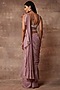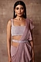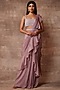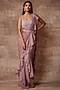 Featuring a vintage plum pre-stitched ruffled saree in chiffon base. It is paired with a matching mesh blouse having cutdana and beads work, including a belt.