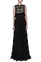 Featuring a black gown in georgette base with attached cape embroidered using gold cutdana and thread work along with silk tassels on the hem.