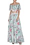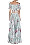 Featuring a blue pleated crop top in crepe silk base with floral print and pearls detailing. It is paired with matching skirt having pearl embroidery on the belt.