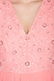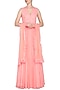 Featuring a peach anarkali kurta in georgette base with attached choker, pleated ghera and embroidery. It is paired matching churidaar pants in stretch net base and dupatta in net base with organza frill.