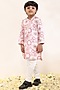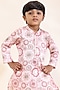 Featuring a pink kurta for boys in satin linen base with print. It is paired with spun silk pants. Accessorize this set with mojris and a watch for a stylish ensemble, ideal for ceremonial events or any festive occasion.