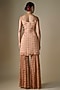 Featuring an almond beige kurta in viscose chiffon base with coin embellishments and geometric print. It is paired with sharara pants and a dupatta. Accentuate it with kundan jhumkas or silver jewellery, embellished heels and a clutch for a dazzling look.