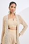 Featuring an antique white blouse in viscose georgette base. It is paired with flared pants and an embellished long cape. Accentuate it with dangler earrings and heels for cocktail or wedding ceremonies.