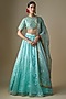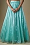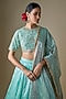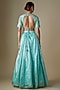 Featuring a blue lehenga in tissue and silk organza base with mirror embroidery. It is paired with an embroidered blouse and a dupatta. Accentuate it with kundan jewellery, embellished heels and a clutch for a wedding or sangeet ceremony.