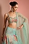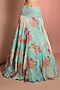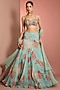Featuring a blue lehenga in viscose organza base with floral print and mirror hand embroidery. It is paired with an embroidered blouse and an embroidered dupatta. Accentuate the designer lehenga with soft curls, swarovski or pearl jewellery and embellished heels for a regal look, Perfect wear for your daytime weddings or sangeet ceremony.