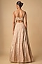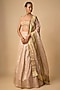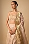 Featuring a blush lehenga in banarasi chanderi base with hand embroidery. It is paired with a blouse and an organza dupatta. Accentuate it with emerald jewellery, embellished heels and a clutch for a bridal look.