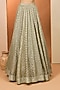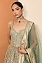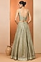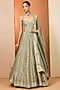 Featuring a green lehenga in banarasi chanderi base. It is paired with a pure raw silk corset blouse having mirror and zardosi hand embroidery, including an organza dupatta. Accentuate it with statement earrings and heels for weddings or mehendi ceremonies.