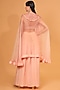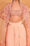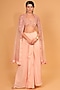 Featuring a peach cape in organza base with mirror, zari and sequins embroidery. It is paired with a matching bustier and crepe dhoti pants.