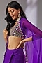 Featuring a purple cape in organza and crepe base with hand embroidery. It is paired with a matching blouse and dhoti pants.