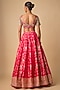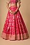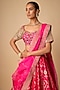 Featuring a rani pink lehenga in raw silk base with hand embroidery. It is paired with a blouse and an organza dupatta. Accentuate it with emerald jewellery, embellished heels and a clutch for a bridal look.