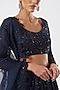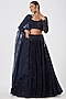 Featuring a dark blue lehenga in organza base with thread, sequins, and pearl embroidery. It is paired with a matching blouse and a net dupatta.