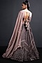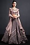 Featuring a grey and blush pink lehenga in crepe, silk modal and chiffon base with block print and zari embroidery. It is paired with a matching blouse and dupatta.