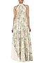 Featuring a grey halter neck gown in flex moss base with digital print. It is paired with a matching belt.