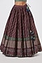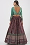 Featuring a wine lehenga in chanderi silk base with block print and hand embroidery. It is paired with a contrasting mehendi green embroidered blouse and an organza dupatta.