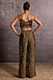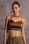 Featuring a copper crop top in cotton, metallised fiber and tissue base with spaghetti straps and border detail. Style it with pants, cape and statement earrings for a boho-themed getaway.