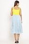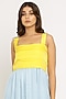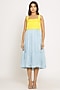 Featuring a yellow and ice blue dress in sustainable silk base with color blocking, gathers, and strap sleeves.