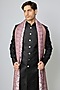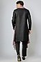 Featuring a black kurta in linen base with threadwork. It is paired with trousers and a kashmiri dupatta. Style it with kolhapuri sandals for a festive occasion, sangeet or engagement ceremony.