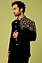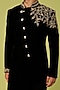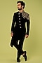 Featuring a black jodhpuri jacket in velvet base with a drape and hand work. It is paired with suiting pants.