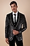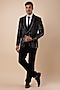 Featuring a black tuxedo in velvet base with shimmer strip detailing. It is paired with a shirt, a waistcoat and trousers. Perfect wear for a wedding or reception ceremony.